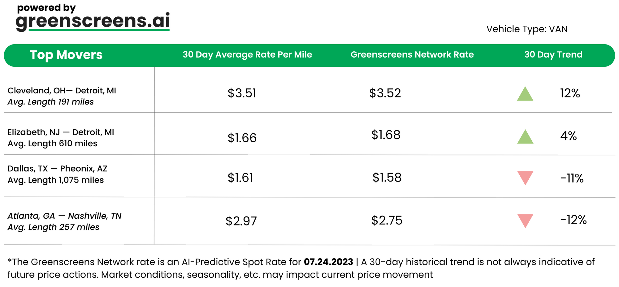 *Greenscreens.ai, forecasts real-time truckload buy prices that are suited to each freight brokerage's purchasing power using AI and machine learning. Its engine takes into account over 130 attributes and data points in each rate forecast.