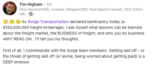 Yesterday, when I received a DM on our Instagram page featuring a FreightWaves article about Surge Transportation filing for Chapter 11 bankruptcy, I was shocked. How could Surge be filing for bankruptcy? They have been a headline sponsor at almost every major conference and event I've attended in recent years. Their name was ubiquitous, having been one of the sponsors of FreightWaves' "What the Truck?!?".