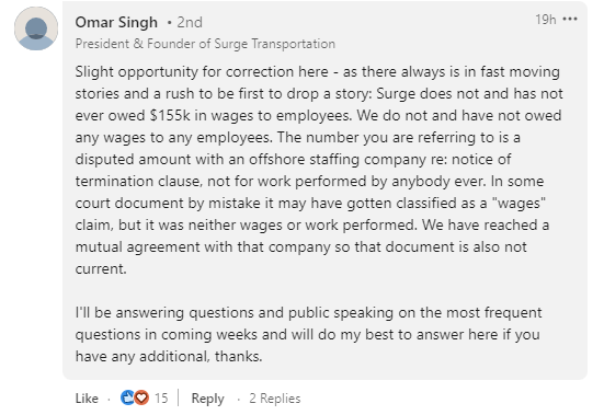 After the posting of this article, Omar Singh posted a commented under our LinkedIn post regarding the statement made about wages owed to employees: