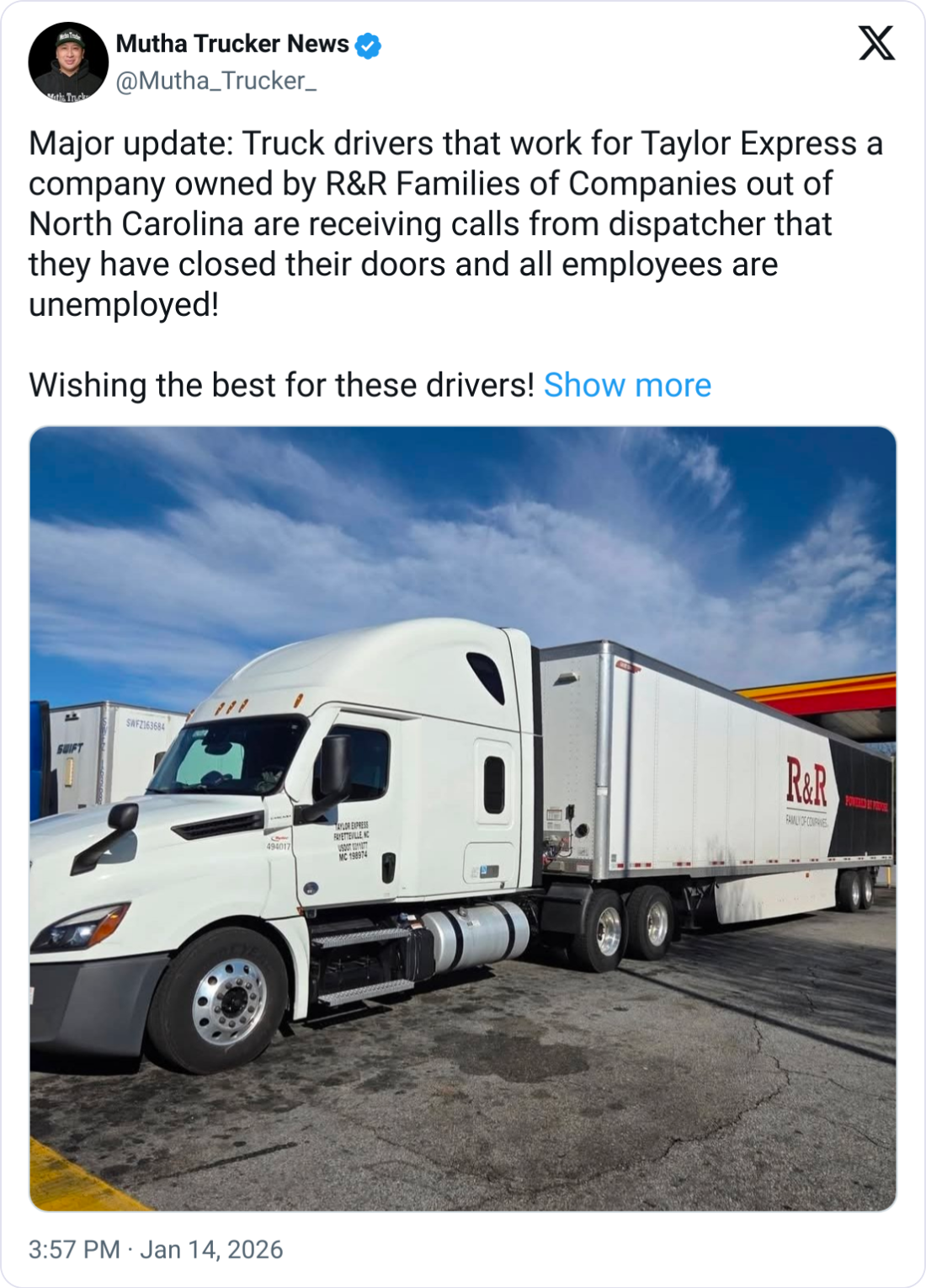 Truck drivers working for Taylor Express, owned by R&R Family of Companies, say they were informed by dispatch that the company has shut down and that employees are now out of work. Credit to Mutha Trucker News.
