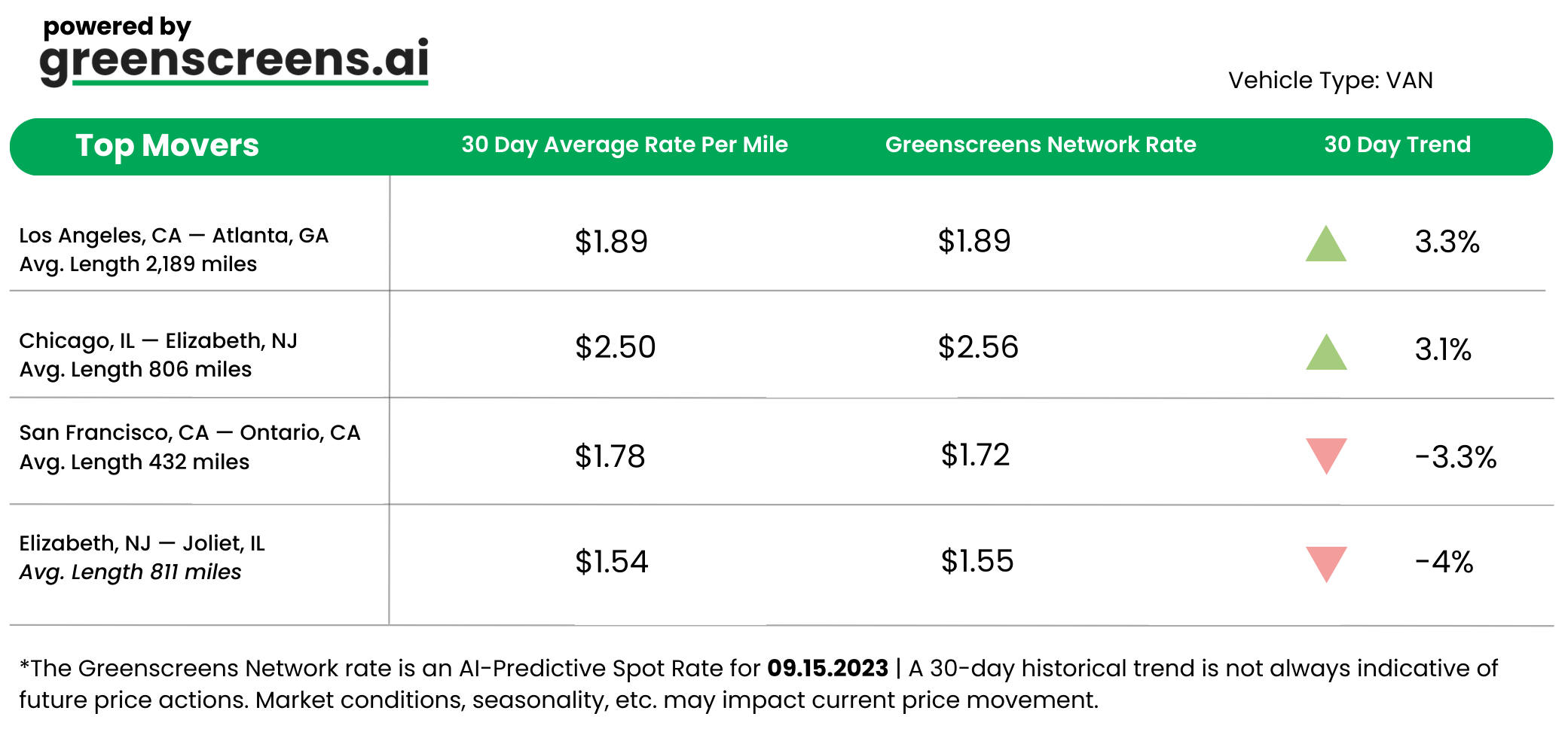 *Greenscreens.ai, forecasts real-time truckload buy prices that are suited to each freight brokerage's purchasing power using AI and machine learning. Its engine takes into account over 130 attributes and data points in each rate forecast.