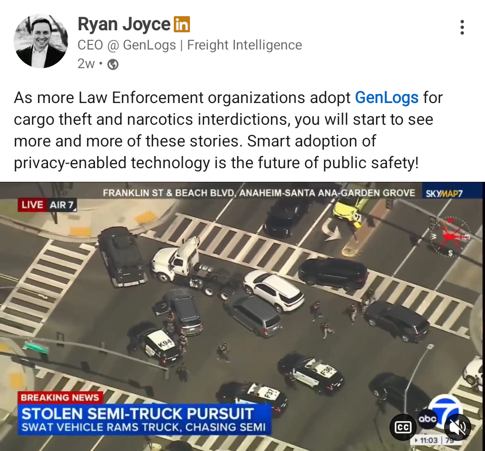 But tools like GenLogs are going further. CEO Ryan Joyce highlighted how law enforcement agencies are adopting GenLogs for cargo theft and narcotics interdictions.
