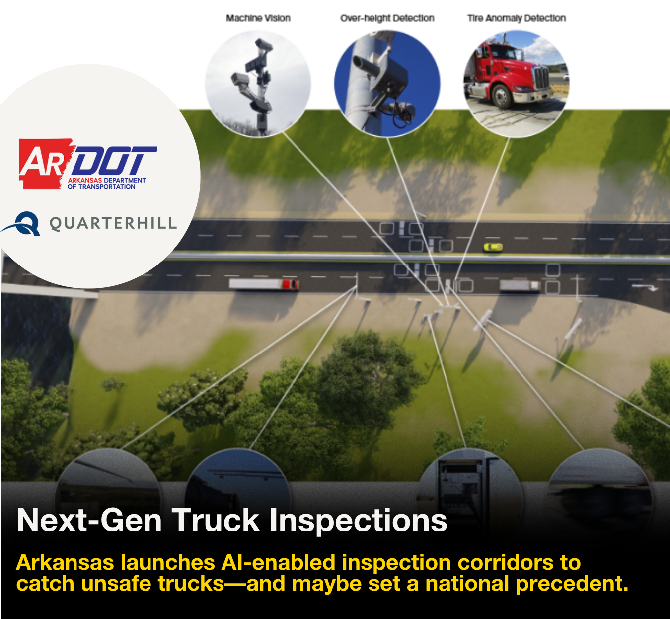 🚦 Arkansas Launches $2.7 Million AI Truck Inspection Project. The Arkansas DOT and Quarterhill Inc. announced a $2.7 million initiative to deploy AI-enabled truck inspection systems along I-40 Eastbound in Lehi and I-55 Southbound in Marion. According to Quarterhill’s October 9 press release, the project will integrate Weigh-in-Motion sensors, tire anomaly detection, license plate recognition, and real-time credential verification to flag safety risks without pulling every truck off the road. “This project demonstrates how technical innovation and collaboration can solve real-world challenges in freight management,” said Quarterhill CEO Chuck Myers.
