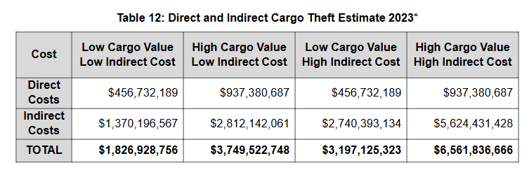 Cargo theft losses ranged from $1.8B to $6.5B in 2023, depending on valuation.