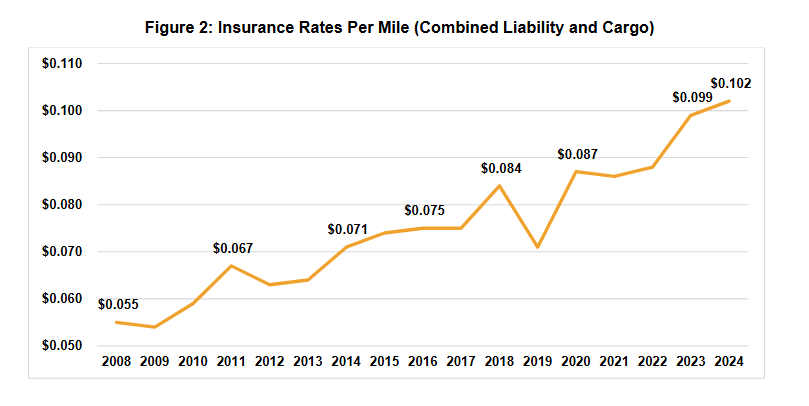 Combined cargo and liability rates have jumped 86% since 2010, hitting $0.102 per mile in 2024. More theft = higher deductibles, tighter underwriting, and fewer affordable options for small carriers and brokerages.