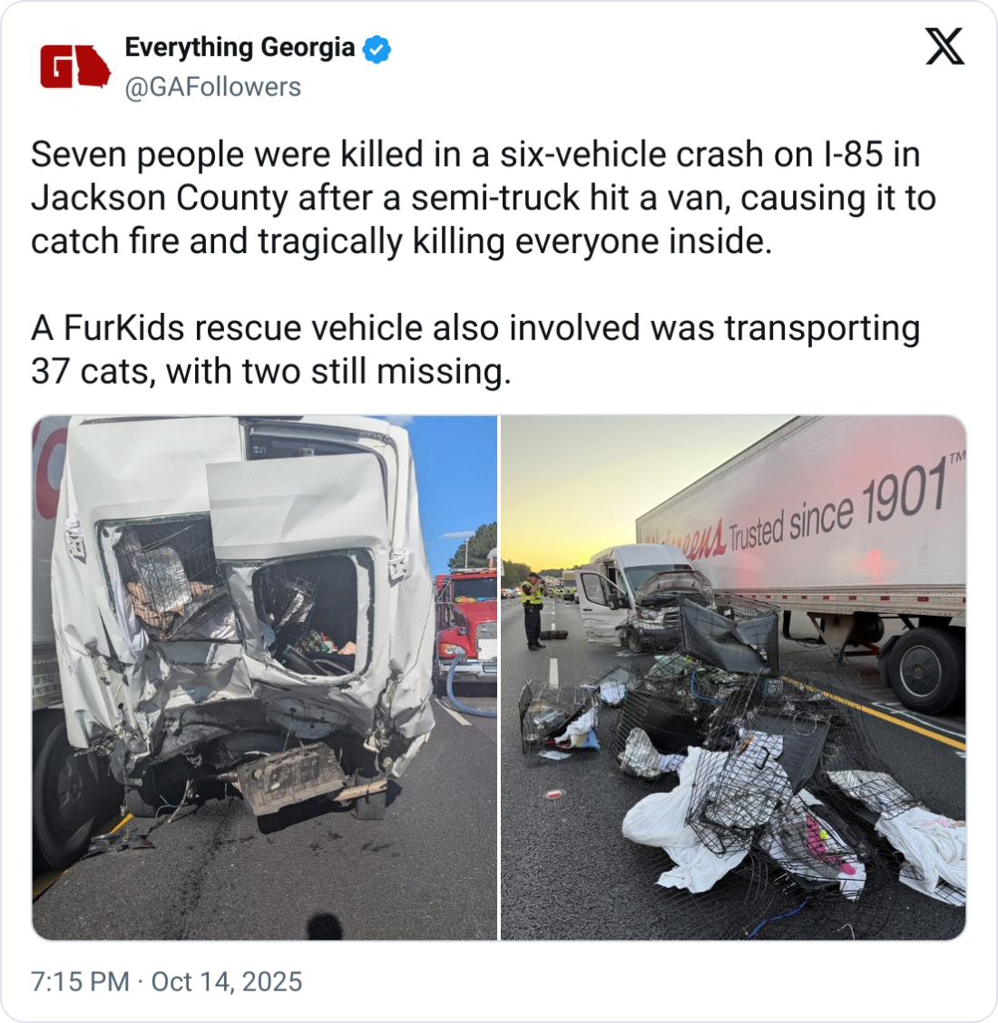 🚨 I-85 Fatal Pileup. Truck driver Kane Hammock, 23, was charged with eight counts of vehicular homicide and one of feticide after a fiery I-85 crash in Jackson County, Georgia, that killed eight people when a semi rear-ended a passenger van.