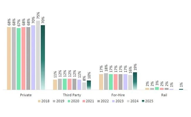 FreightWaves Analyst Thomas Wasson notes private fleets’ share slipped to 70% this year, while brokers and 3PLs held 10%. That’s a reversal from the post-COVID years when private fleets had been gaining ground, a trend that began in 2017.