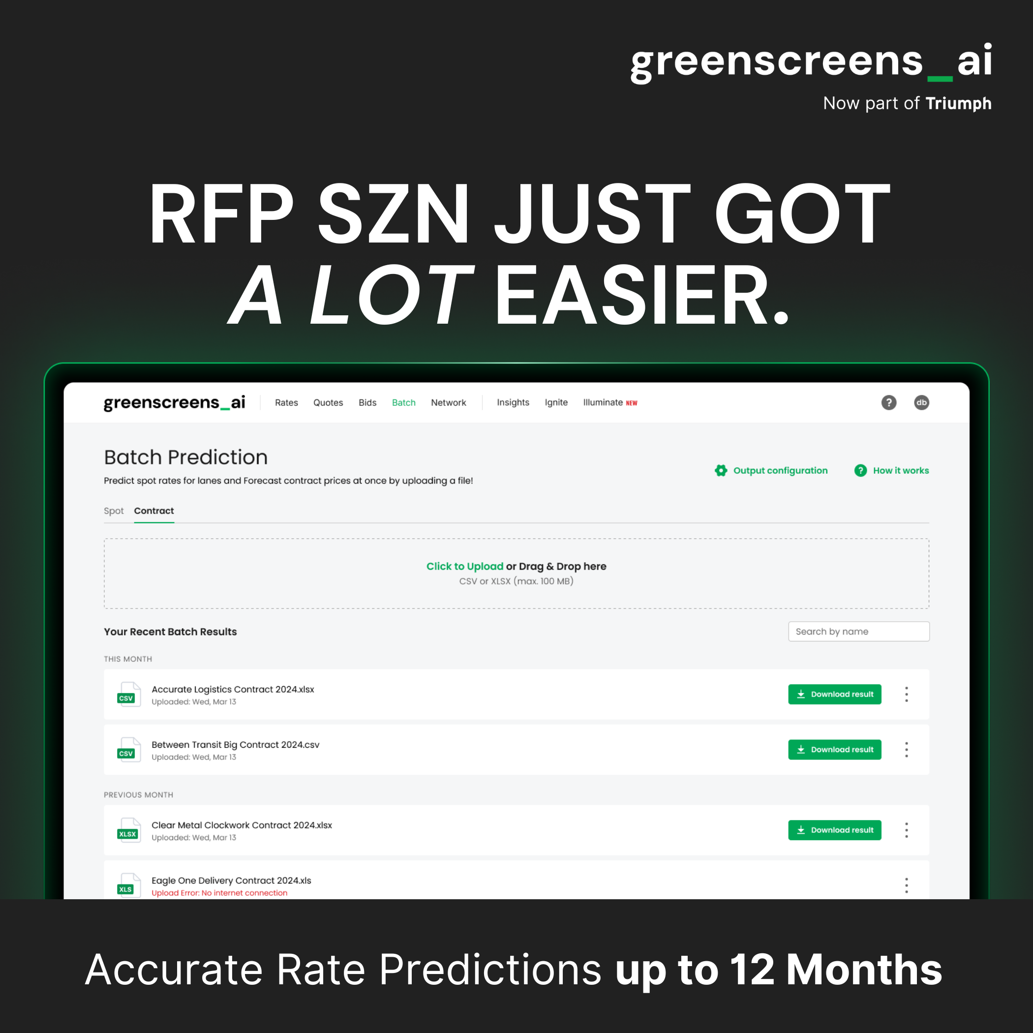 Don’t let RFP season catch you scrambling. Greenscreens' long-term rate prediction tool delivers accurate monthly freight forecasts up to 12 months out — With seamless system integration and support for high volume lane uploads, it improves efficiency, accelerates user adoption, and reduces time to respond to RFPs.