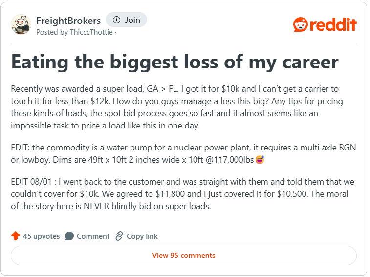 Ultimately, the broker took ownership. They returned to the customer, explained the issue, and renegotiated to $11,800, covering the load for $10,500, a painful but manageable hit. As one redditor said: