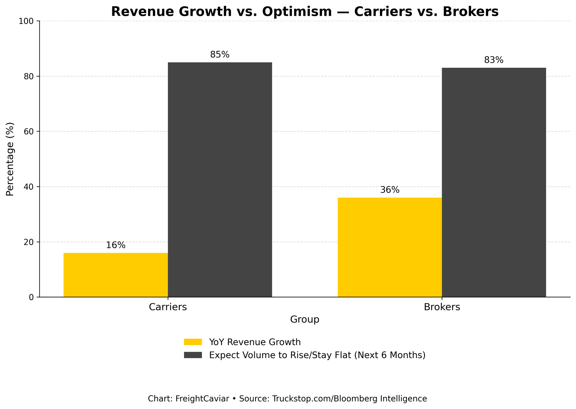 Brokers are far more upbeat about demand than carriers. While 37% of brokers reported higher load volumes year-over-year, only 19% of carriers said the same.