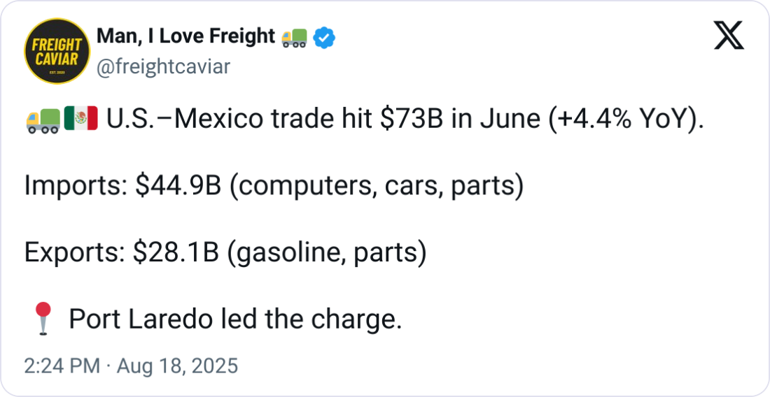 🌐 Trade Tops $73 Billion. U.S.–Mexico trade surged 4.4% year-over-year in June, totaling $73 billion, with $44.9 billion in imports (computers, vehicles, auto parts) and $28.1 billion in exports (gasoline, auto parts), led by Port Laredo.