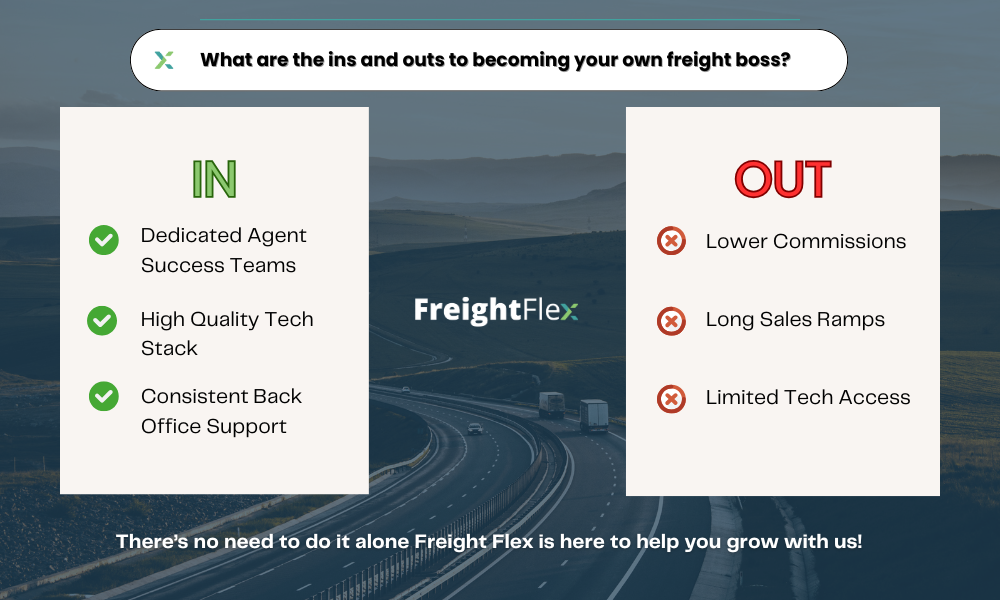 Whether you're a Freight Agent seeking cutting-edge tools and transparent commission plans or a Freight Broker at a large firm ready to launch your own business, Freight Flex has your back.