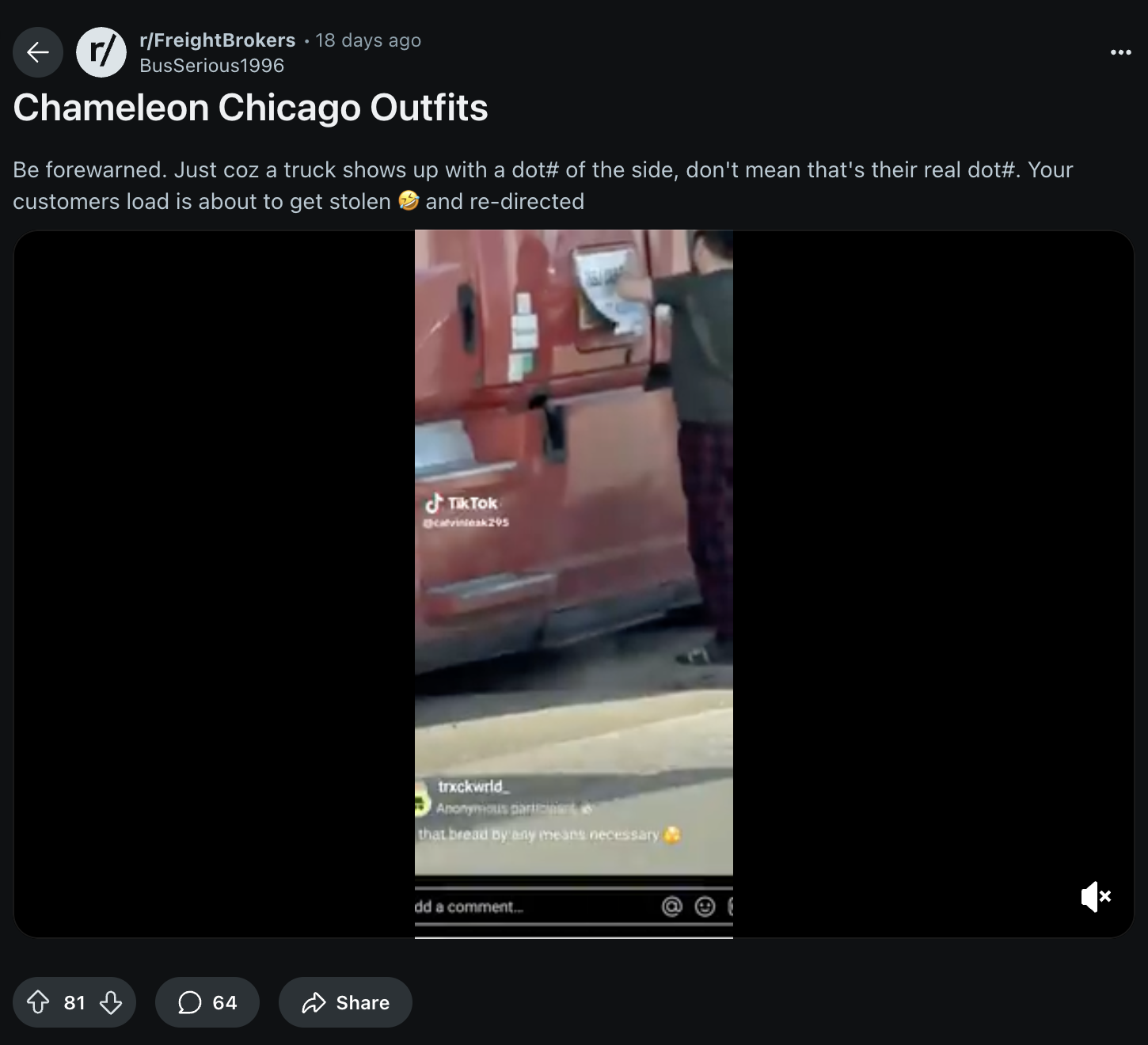 A recent Reddit thread in r/FreightBrokers shows how some āChicago Chameleonsā may very well be up to no good. In a viral video, a driver was caught changing his DOT# on the side of his truck, taping it nonchalantly for everyone to see.