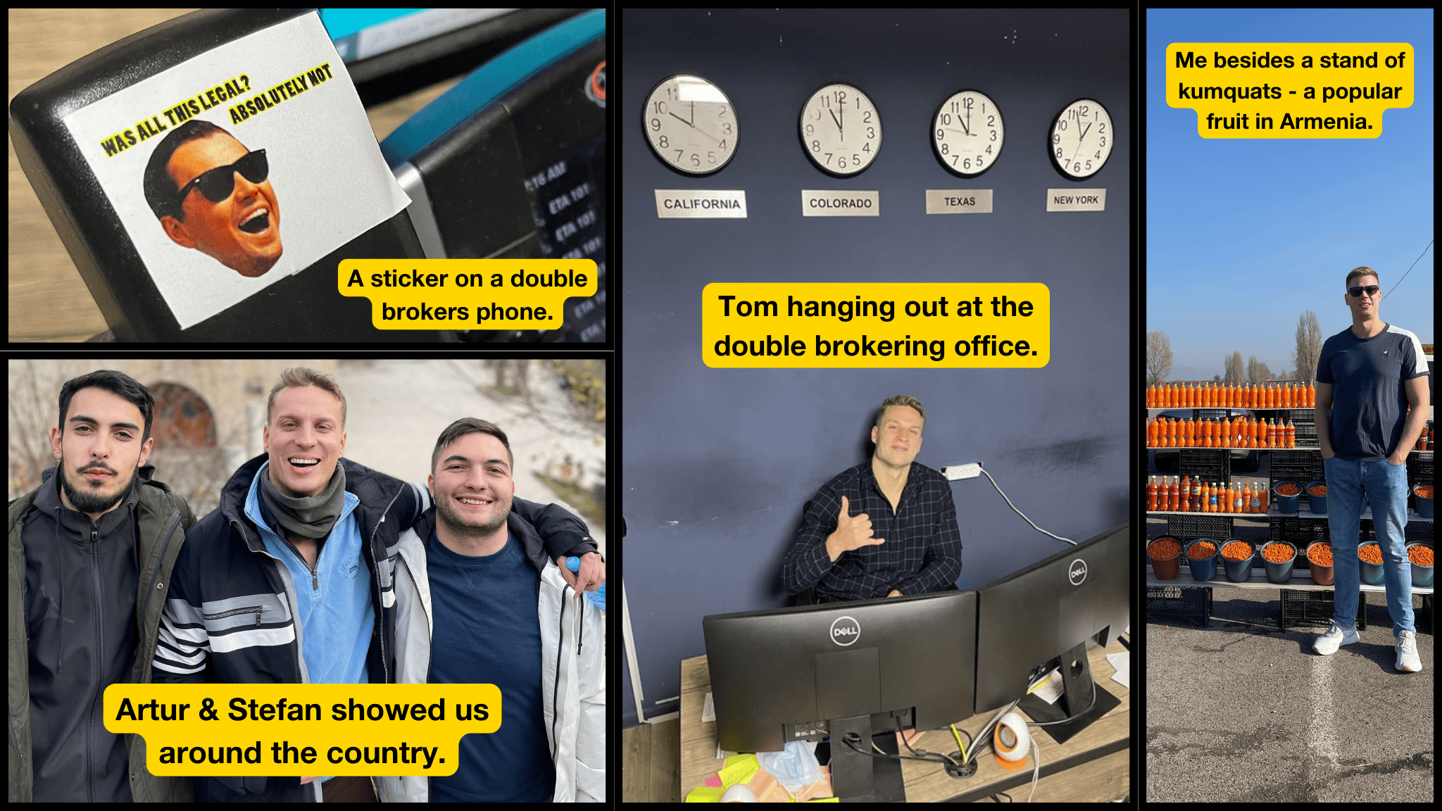 Within minutes, six men stormed the office (they looked like mafia), furious that we were there. They demanded we delete all the footage (we had interviews with the double brokers) and my memes making fun of Armenian double brokers.