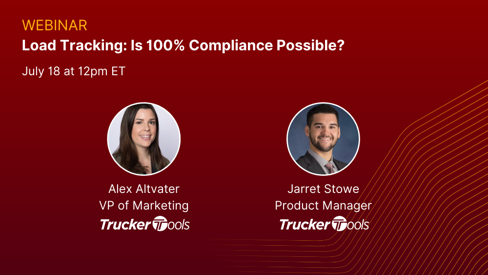 Join us on Tuesday, July 18th at 12pm EST for our webinar, Load Tracking: Is 100% Compliance Possible. Hear from Trucker Tools Vice President of Marketing, Alex Altvater, and Broker Product Manager, Jarret Stowe on: