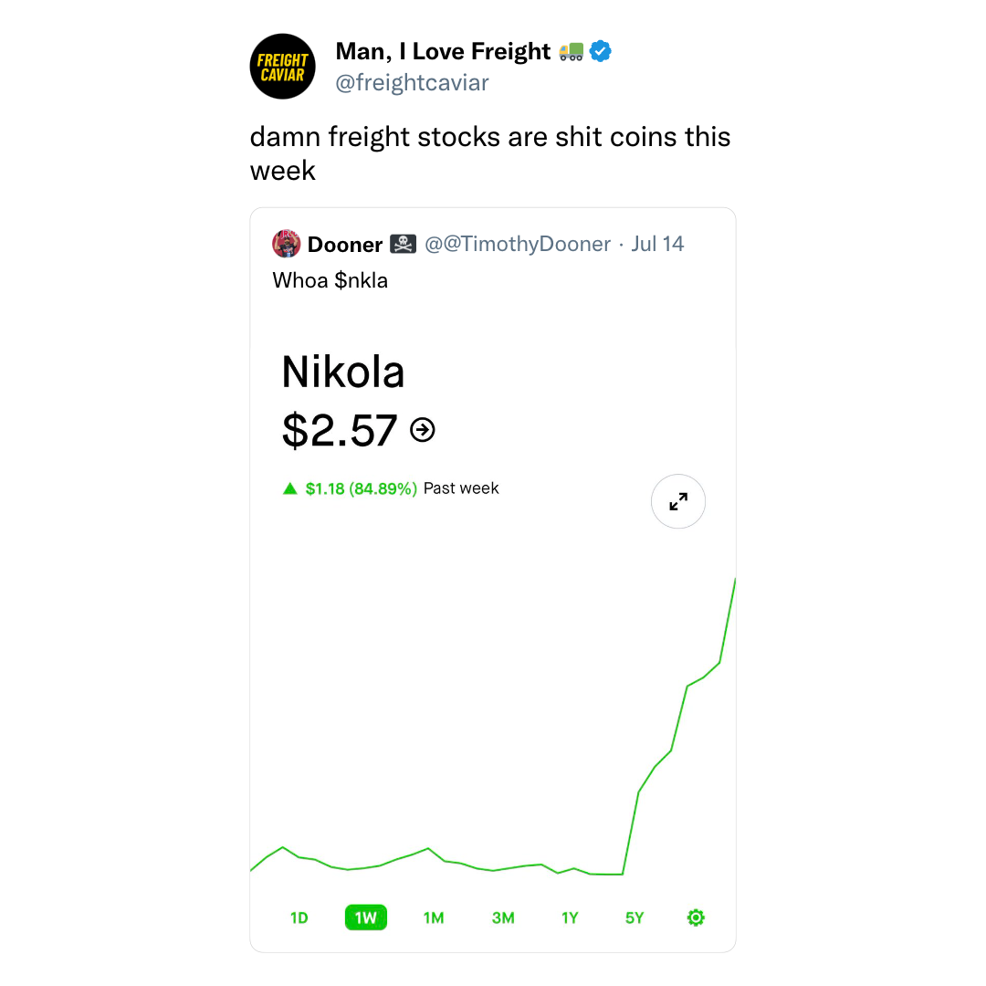 🚀 Two Freight Stocks Going to the Moon. Last week, we saw two freight stocks, Nikola and Yellow, trading like unpredictable cryptocurrencies. Nikola, at one point, saw its share price jump 85% over a seven-day period, while Yellow experienced a 43% increase week-over-week. Both stocks have since retreated a bit, but at their current prices, Nikola is up 55% in the last five days, while Yellow is up 24%.