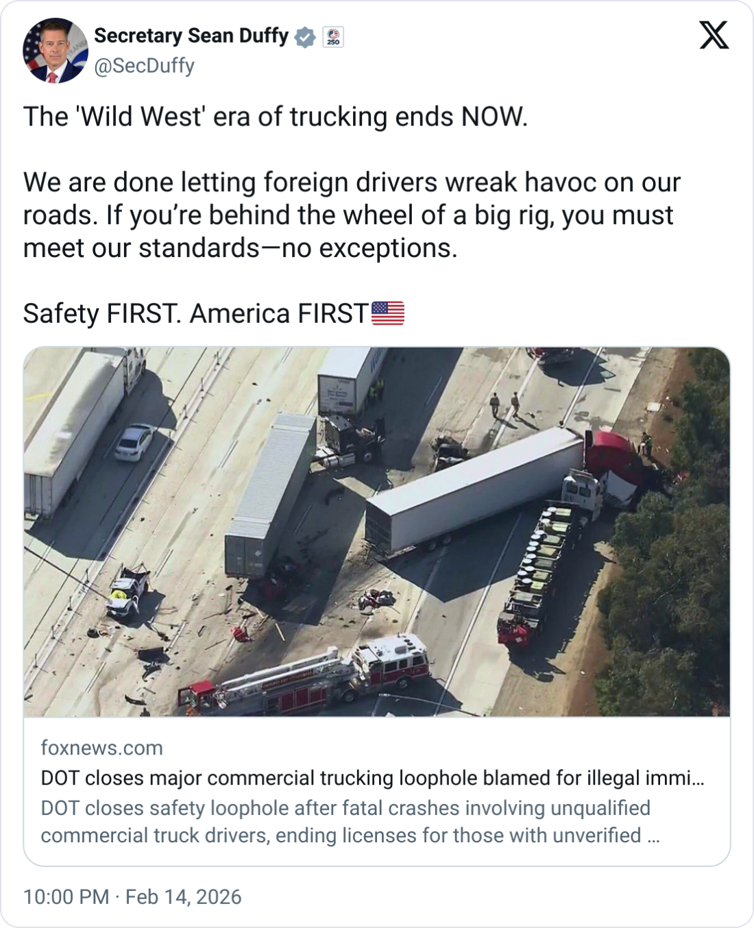 Transportation Secretary Sean Duffy called the crash part of a broader safety crisis and signaled tougher enforcement ahead.