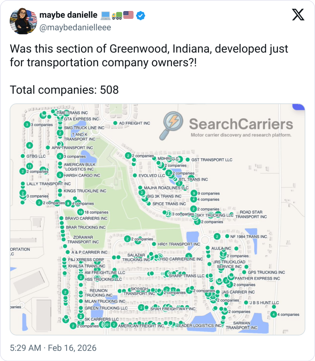 Research shared by Danielle Chaffins, using SearchCarriers.com, highlights dense pockets of registered carriers in Greenwood, Indiana, with hundreds tied to the same neighborhoods.
