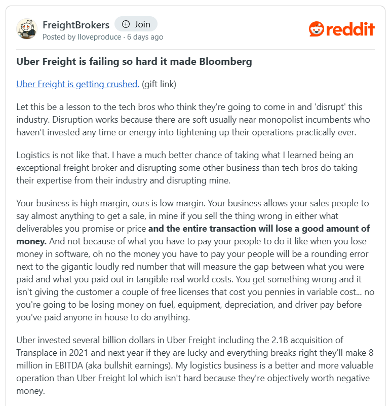 A Redditor on r/FreightBrokers reacted to Bloomberg’s recent report on Uber Freight’s financial performance, offering a pointed reflection on the disconnect between tech-driven disruption and the operational demands of freight. The post sparked renewed discussion around the challenges of scaling in a low-margin, execution-heavy industry.