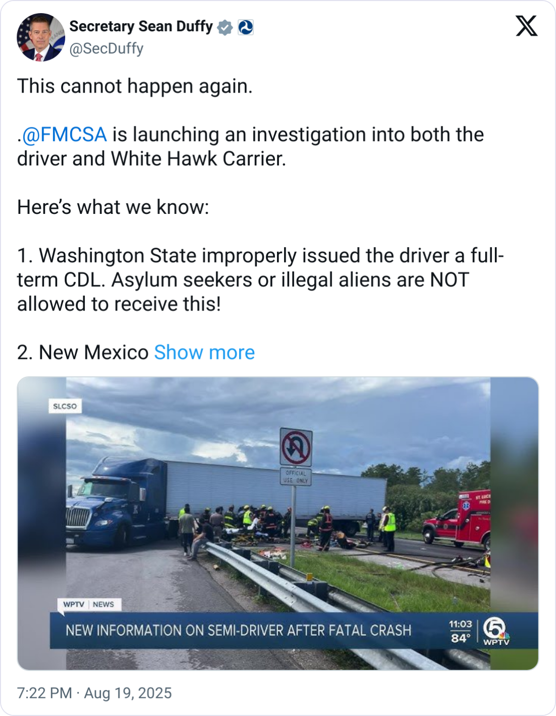 The X post cited multiple state-level licensing failures, calling them “despicable” and a direct cause of the tragedy. Duffy stated that if states had followed federal rules, “this driver would NEVER have been behind the wheel and three precious lives would still be with us.”