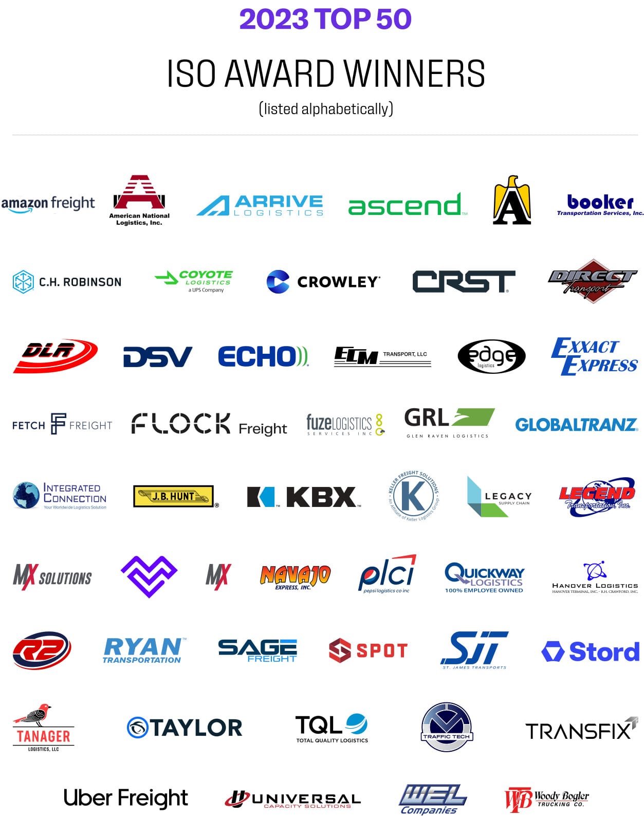 ISO honored Convoy, who would have been a Top 50 performer but for the company ceasing operations in October 2023. Even as Convoy bows out, its mention calls attention to the evolving landscape of digital freight brokerage. ISO nods to the "hard-working employees and technology that will continue to move our industry forward," as evidenced by Flexport's recent relaunch of the Convoy Platform.
