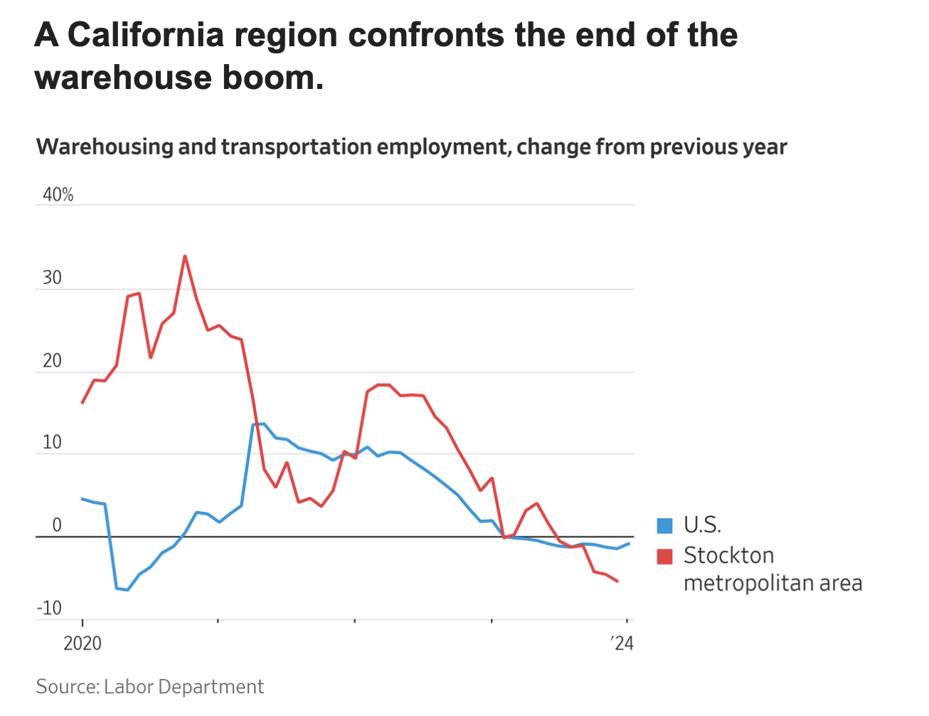 ๐ Stockton, CA: Warehouse Boom to Gloom. Once, towns like Stockton, California rode the high wave of the e-commerce boom, with giants like Amazon transforming sleepy towns into bustling freight hubs, creating jobs and economic growth. But as the online shopping frenzy cools, these towns face a new reality: job cuts and economic uncertainty. Nationally, warehousing employment dipped by 0.9% from the previous year in January, while Stockton experienced a sharper decline of 5.4% YoY. Plus, Stockton's unemployment rate shot to 6.8% from a low of 4.4% in May 2022.