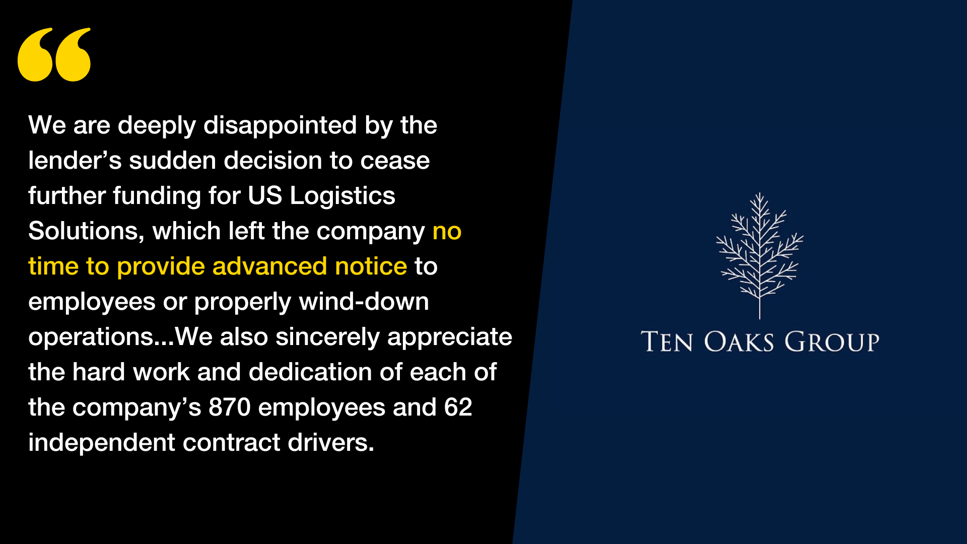 π£οΈ Ten Oaks Speaks Out. Ten Oaks, a private equity firm, has addressed the sudden shutdown of its subsidiary, U.S. Logistics Solutions (USLS), which we reported earlier this week. The company stated that the closure affected 1,200 employees and was due to a third-party lender withdrawing financial support. This financial issue did not involve Ten Oaks directly.