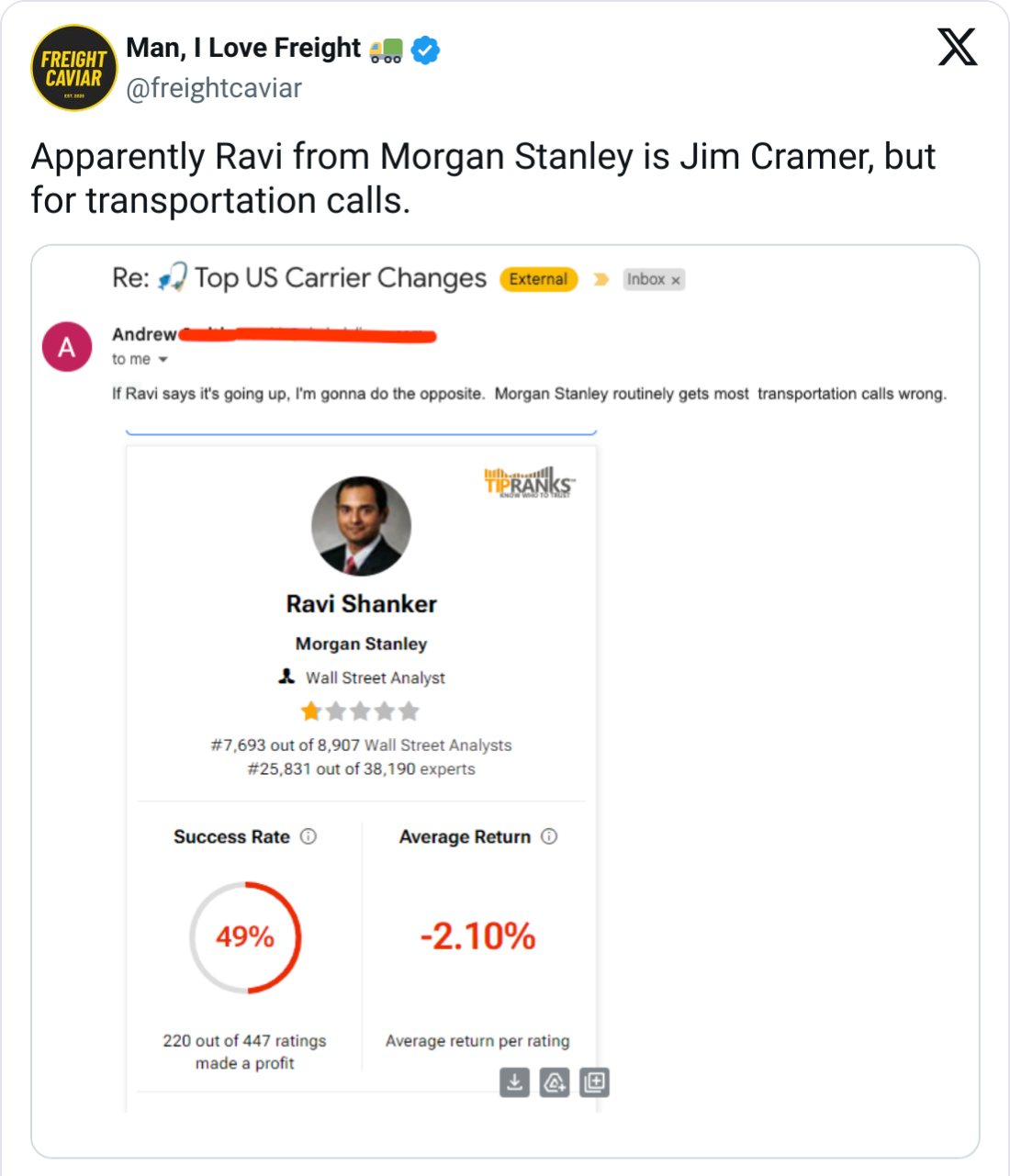 π The Jim Cramer of Freight? After we reported that Morgan Stanley is bullish on the freight market on Wednesday, a reader of our newsletter called out Ravi, a Morgan Stanley transportation analyst, for often being wrong.