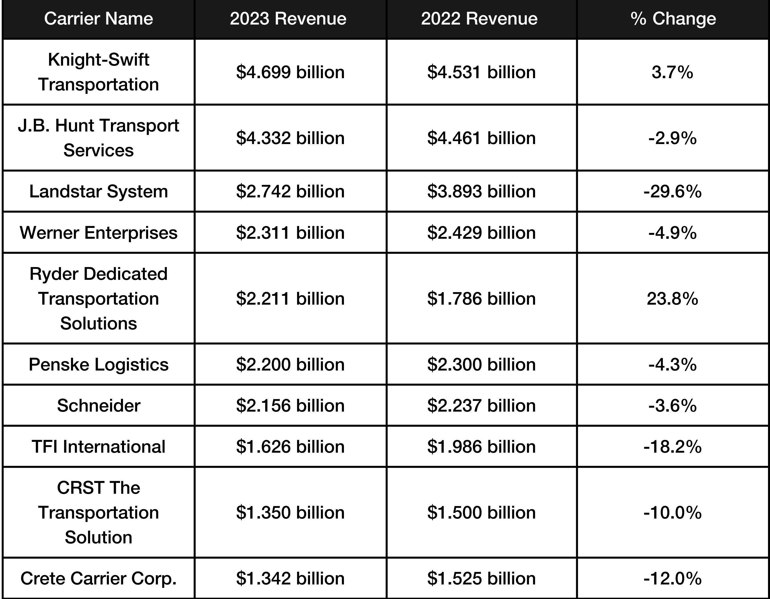 Here's the Top 10 Dedicated Carriers list and their change in revenue from 2022 to 2023.