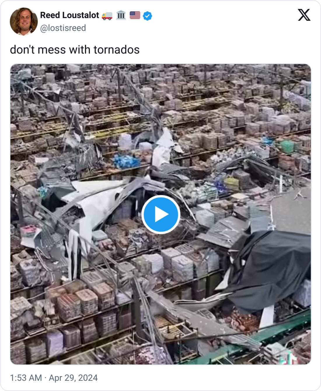 Good morning, Monday. Tornadoes rampaged throughout the US this weekend. A video of a tornado damaging a Dollar Tree Distribution Center in Oklahoma City went viral yesterday. Luckily, nobody was hurt at the facility. Scroll below to click the link and see videos from this weekend's onslaught.