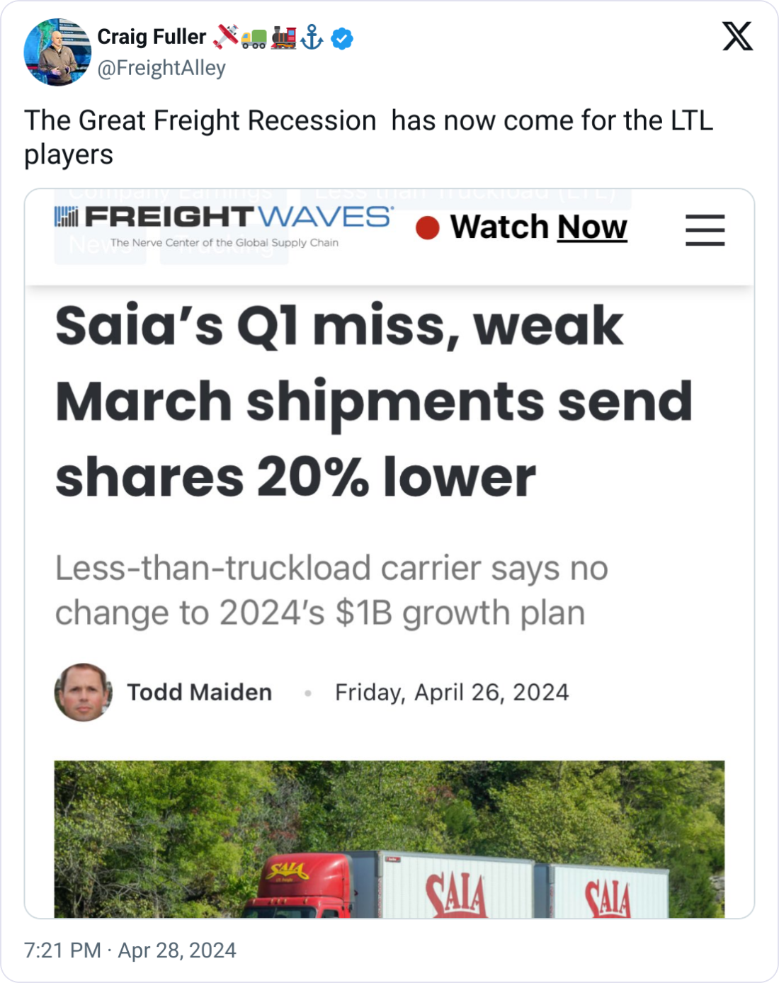 🤔 Question of the Day: Saia's share price fell __% after its Q1 earnings report; however, the stock price is still up 47% in the past year. Scroll to our main story to find the answer.