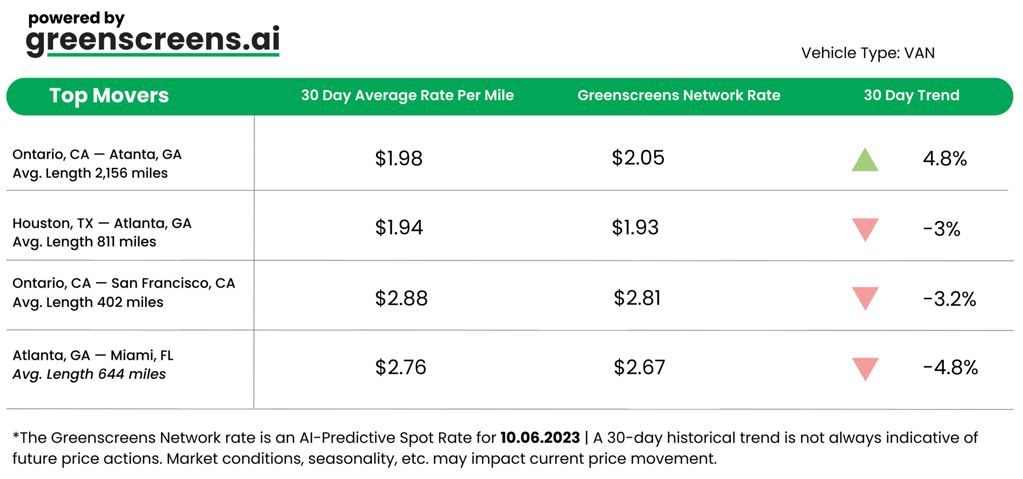 *Greenscreens.ai, forecasts real-time truckload buy prices that are suited to each freight brokerage's purchasing power using AI and machine learning. Its engine takes into account over 130 attributes and data points in each rate forecast.