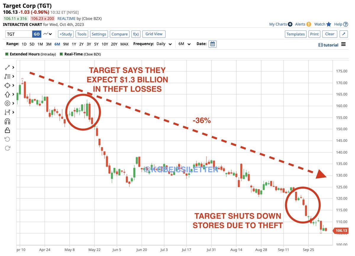 📉 Target's $30B Slide Amid Theft Surge. Following a series of significant theft incidents and subsequent store closures in cities like New York and San Francisco, Target's $TGT stock value has plummeted, wiping out $30 billion in market value over six months.