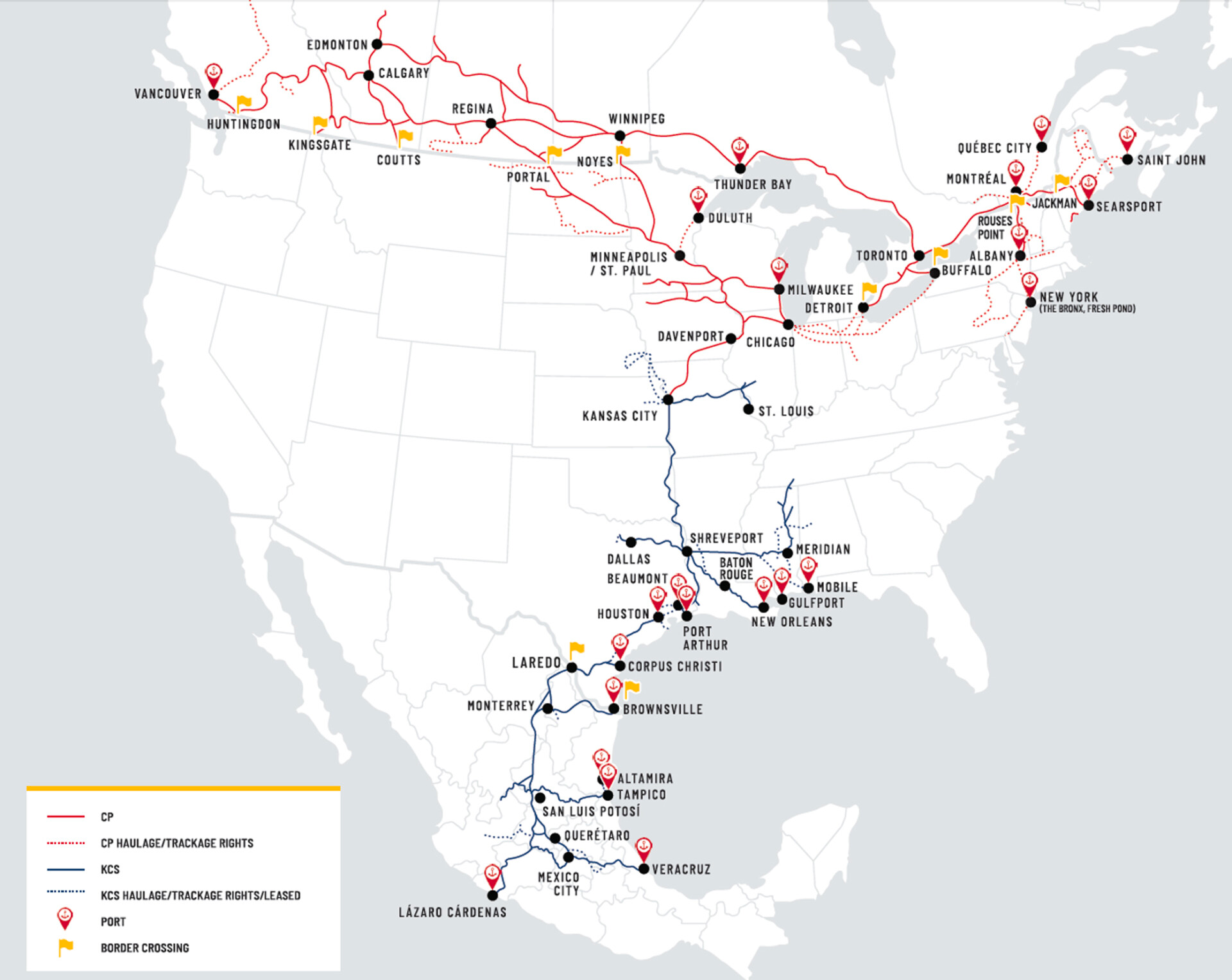 The CPKC (Canadian Pacific Kansas City) rail line connects all 5 host cities outside the US (Toronto, Vancouver, Guadalajara, Mexico City, Monterrey) as well as 3 cities within the US (Dallas, Houston, and Kansas City). The newly merged CPKC line is the only railroad that runs transcontinental from the Atlantic to the Pacific in Canada, as well as Transnationally from Mexico north through the US to Canada.