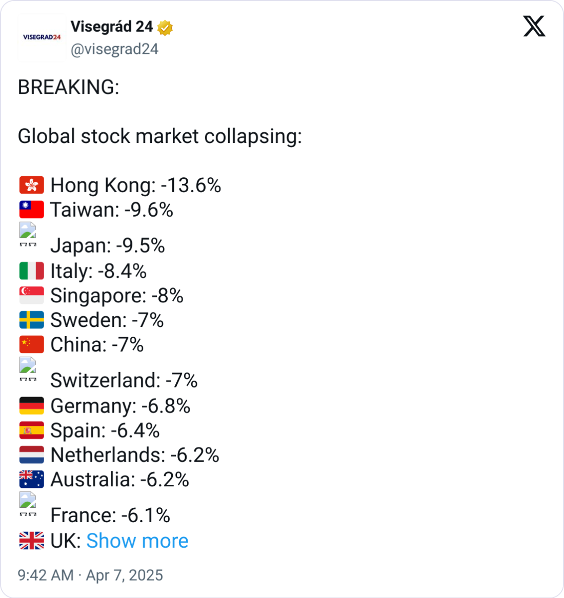 📉 Markets in Meltdown. Global stock markets are plunging following Trump’s sweeping tariff announcement last week. From Hong Kong (-13.6%) to Germany (-6.8%), investor panic is rippling across continents.