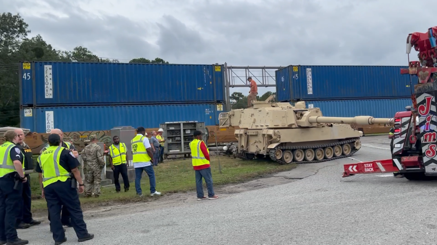A train slammed into an 18-wheeler carrying a military vehicle in Goose Creek, South Carolina.