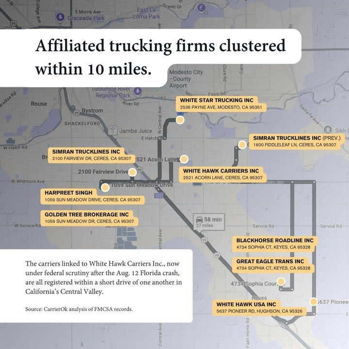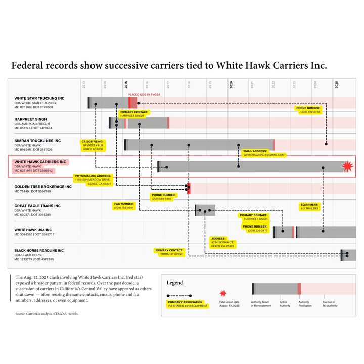 But the crash also highlights broader issues. Public data links White Hawk Carriers to a web of other trucking companies via shared emails, phone numbers, and equipment. These overlaps don’t prove control but resemble patterns seen in “chameleon carriers,” firms that re-register under new names to dodge enforcement.