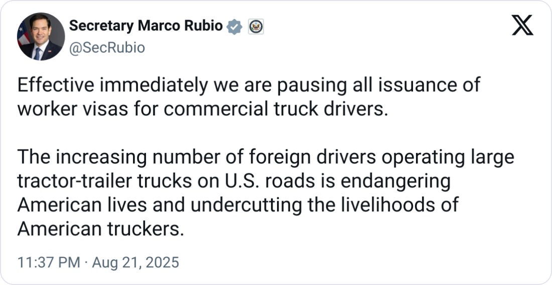 🚨 U.S. Freezes Work Visas for Foreign Truck Drivers. The Trump administration has suspended work visas for foreign truck drivers after the fatal August 12 Florida Turnpike crash involving undocumented driver Harjinder Singh. Secretary of State Marco Rubio announced the freeze on August 21, while Transportation Secretary Sean Duffy said, “Non-enforcement and radical immigration policies have turned the trucking industry into a lawless frontier.” The move has sparked debate across the industry. One commenter on USA_Transportation’s Instagram post warned, “Rates to Laredo, TX are about to go through the roof.” ATA COO Dan Horvath said Singh “should never have been behind the wheel,” highlighting renewed scrutiny on state CDL licensing practices.