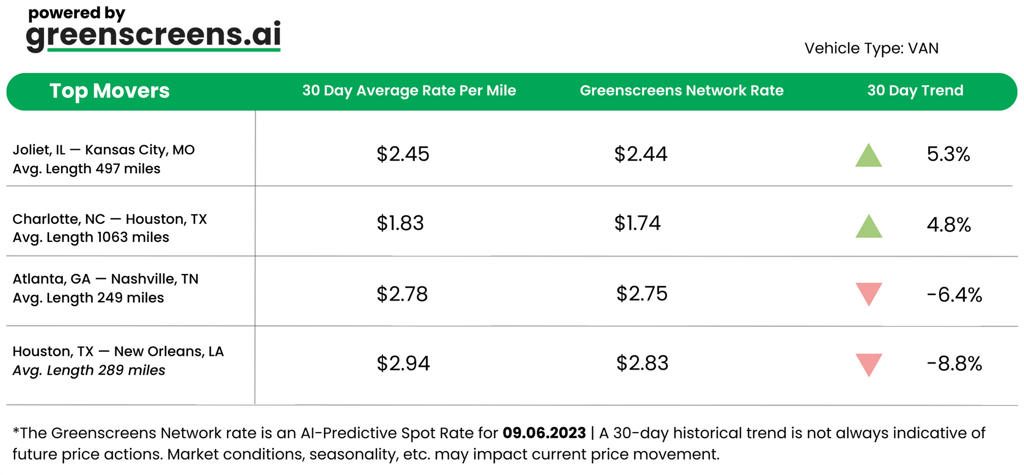 *Greenscreens.ai, forecasts real-time truckload buy prices that are suited to each freight brokerage's purchasing power using AI and machine learning. Its engine takes into account over 130 attributes and data points in each rate forecast.
