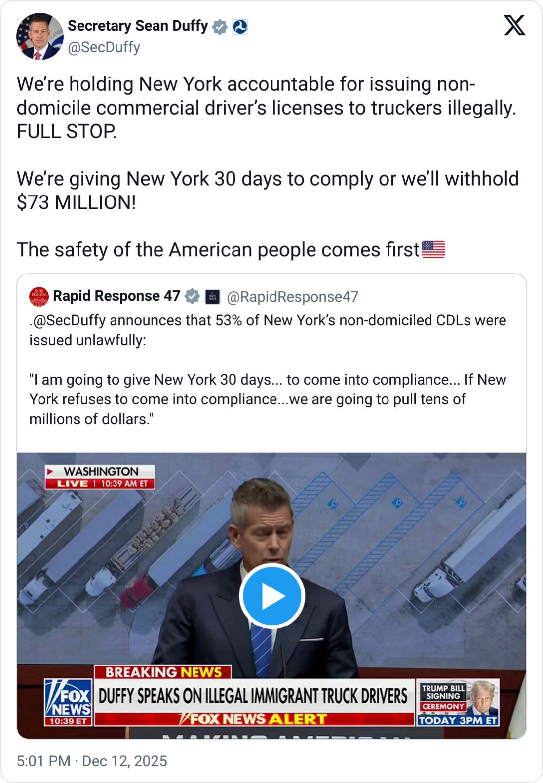 "When more than half of the licenses reviewed were issued illegally, it isn't just a mistake—it is a dereliction of duty by state leadership." – DOT Secretary Sean P. Duffy