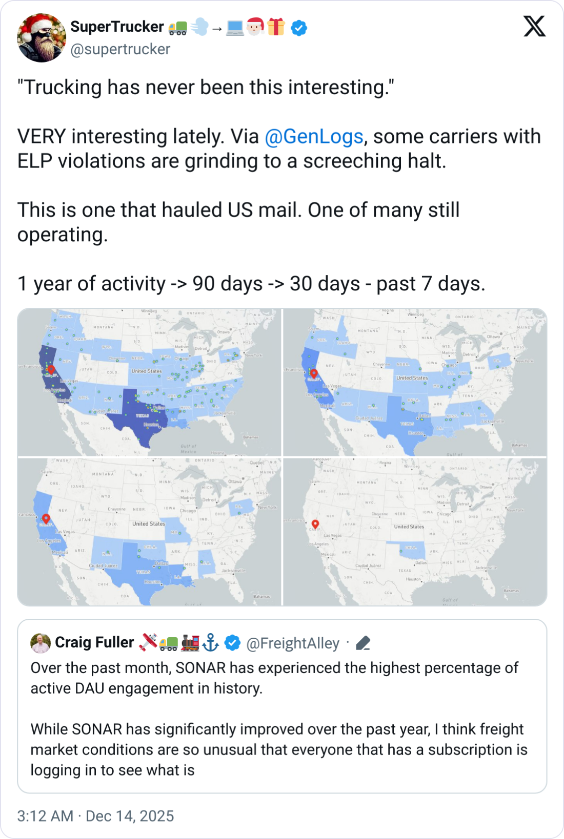 Data from GenLogs, shared via SuperTrucker, visualizes the impact. Maps of carrier activity show fleets with ELP violations "grinding to a screeching halt," with activity shrinking from nationwide coverage to near-zero in just 30 days.