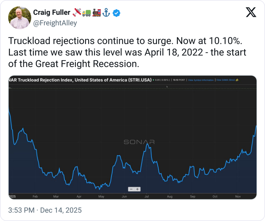📈 Rejections Hit Double Digits. FreightWaves CEO Craig Fuller, who famously called the 2022 freight recession, asserts the SONAR Truckload Rejection Index (OTRI) breaking 10% is key. This level indicates shippers are struggling to cover freight due to tightening capacity. Fuller argues this is the "largest capacity purge in history," driven by fraud crackdowns. Commenters are split. Many veteran carriers are relieved, seeing it as a long-awaited capacity retraction due to illegal CDLs leaving. Others are skeptical, labeling it seasonal or purely supply-driven, warning, "Dormant carriers waiting for better rates will re-enter when rates improve, and rates will drop again."