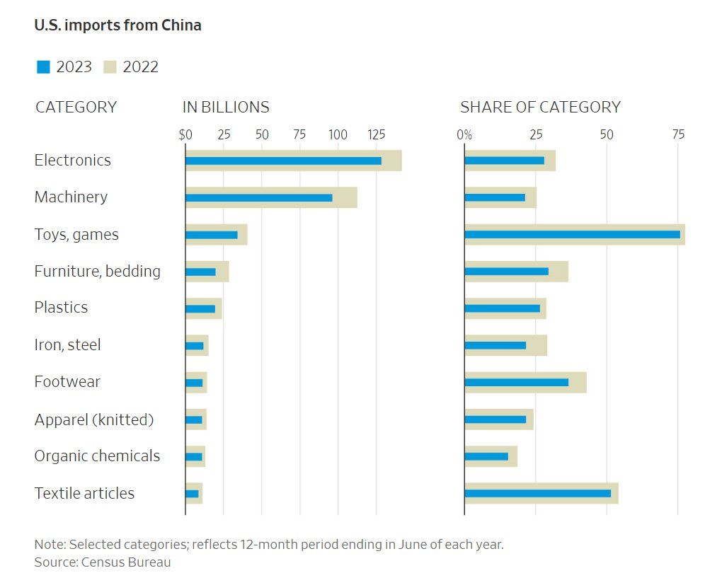 A Steady Decline in China's Share of U.S. Goods. Over the past two decades, there's been a steady decline in the percentage of goods the U.S. imports from China. The first half of 2023 marked the lowest in 20 years, with China accounting for 13.3% of U.S. imports, a decrease from a peak of 21.6% in 2017.