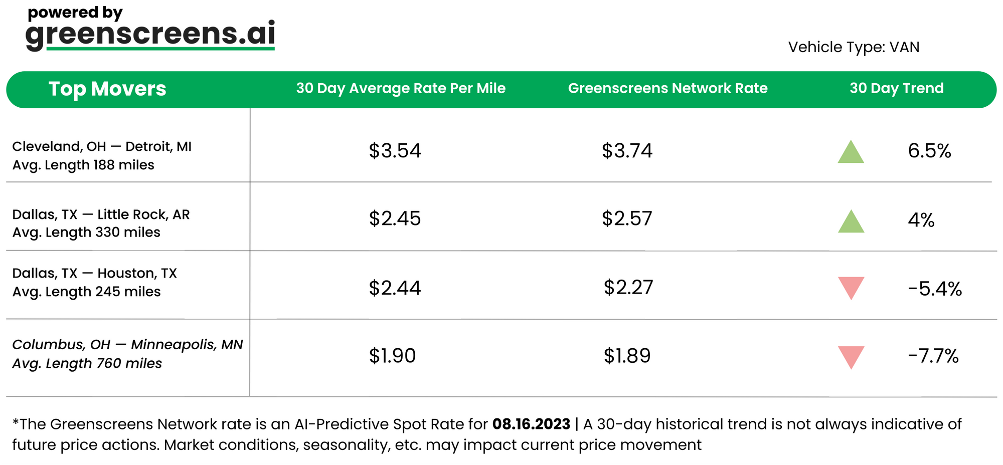 *Greenscreens.ai, forecasts real-time truckload buy prices that are suited to each freight brokerage's purchasing power using AI and machine learning. Its engine takes into account over 130 attributes and data points in each rate forecast.