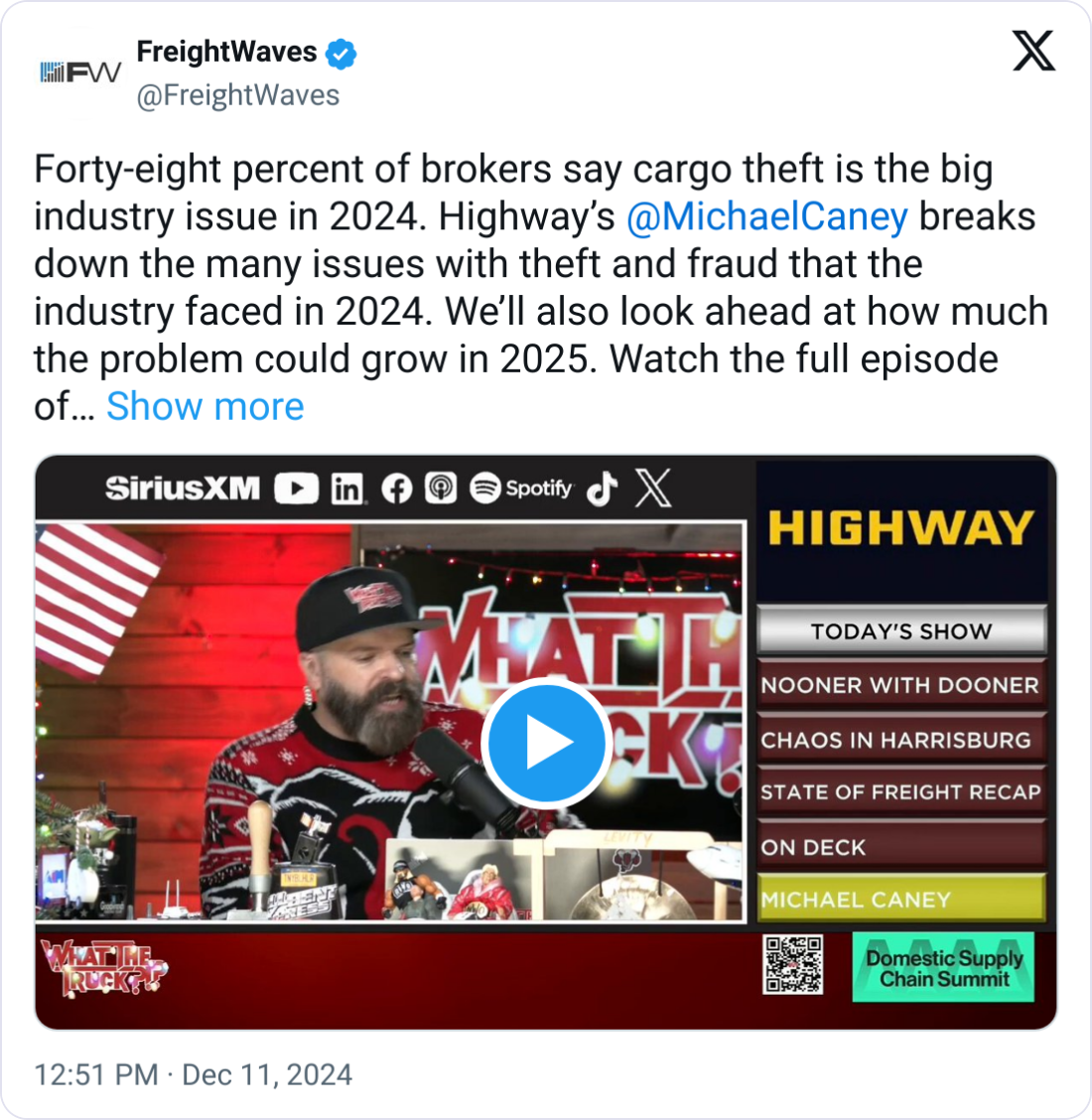 š 48% Say Theft Tops 2024. Nearly half of brokers name cargo theft as 2024's top issueāwatch Highwayās Michael Caney on What The Truck?! to explore trends and 2025 projections here.