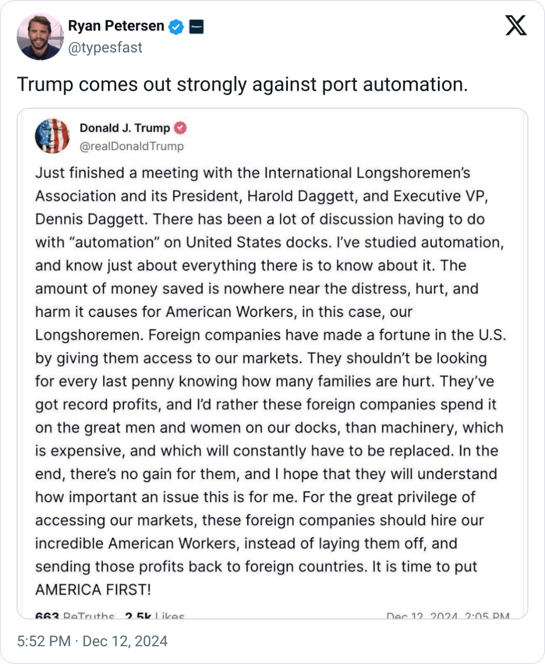 In a recent meeting with ILA leaders Harold and Dennis Daggett, Trump doubled down on his opposition to port automation, stating:
