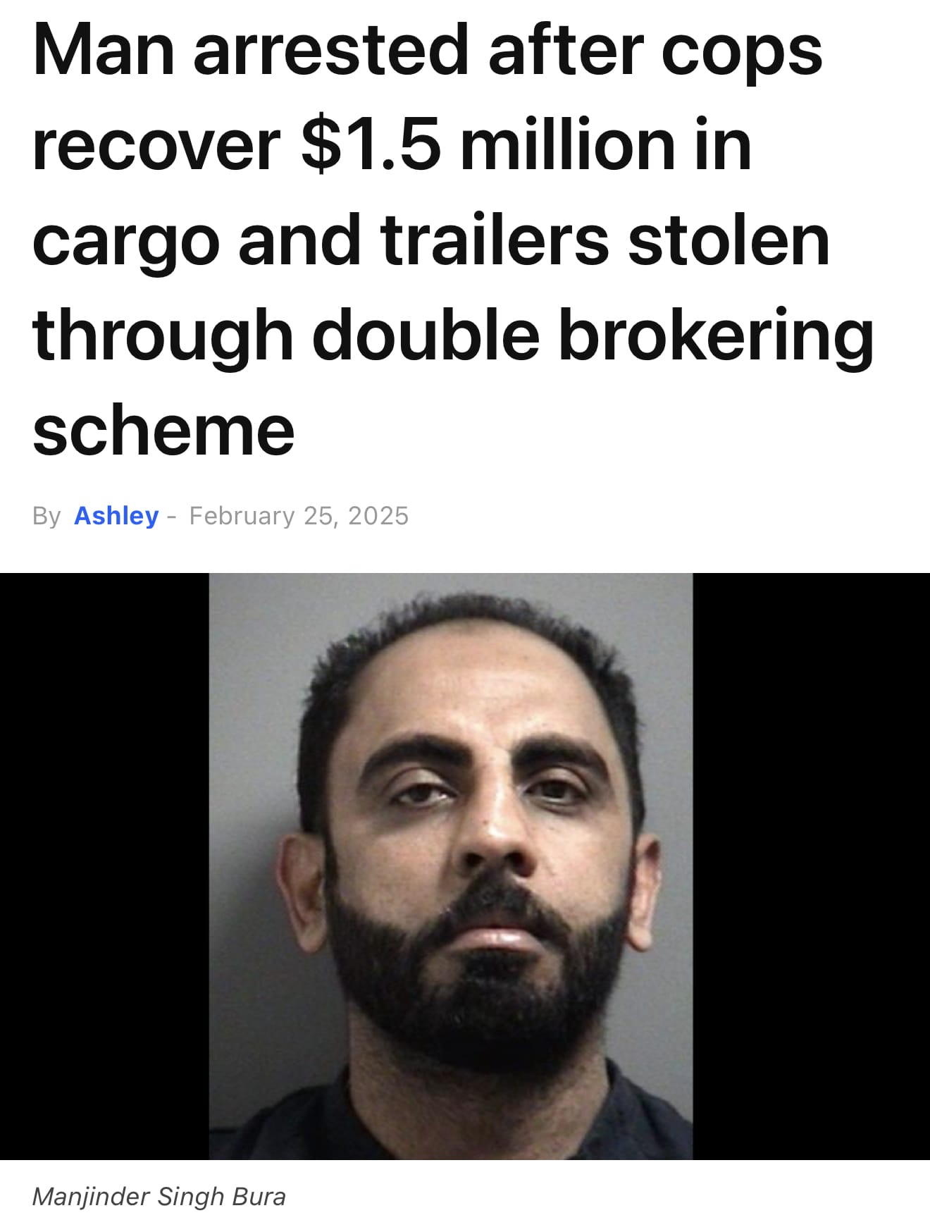 🚨 Brampton Man Arrested in Cargo Theft Scheme. Peel Regional Police arrested Manjinder Singh Bura, 41, of Brampton, in connection with a $1.5 million in theft through a double brokering scheme. Bura, owner of Bura Limited Inc., allegedly operated through All Days Trucking. The scheme involved offering discounted freight services via online platforms, dispatching third-party carriers to collect cargo, then cutting communication before delivery. On February 19, 2025, authorities executed seven search warrants, recovering stolen trailers and goods (valued at the earlier stated $1.5 million). Bura faces multiple theft, fraud, and possession charges as the investigation continues, with more charges anticipated.