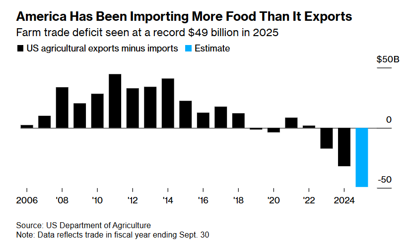 The U.S. agricultural trade deficit is projected to hit $49 billion in 2025, the largest ever.