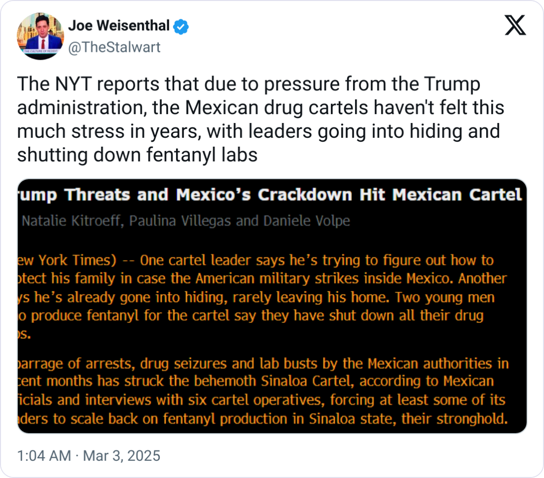 Security concessions: Mexico has deployed 10,000 National Guard troops to the border and extradited 29 cartel figures to the U.S. as part of broader negotiations.