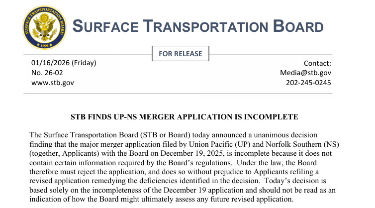 Happy MLK Day. Union Pacific’s proposed merger with Norfolk Southern has been rejected by the STB, forcing the railroads back to the drawing board.